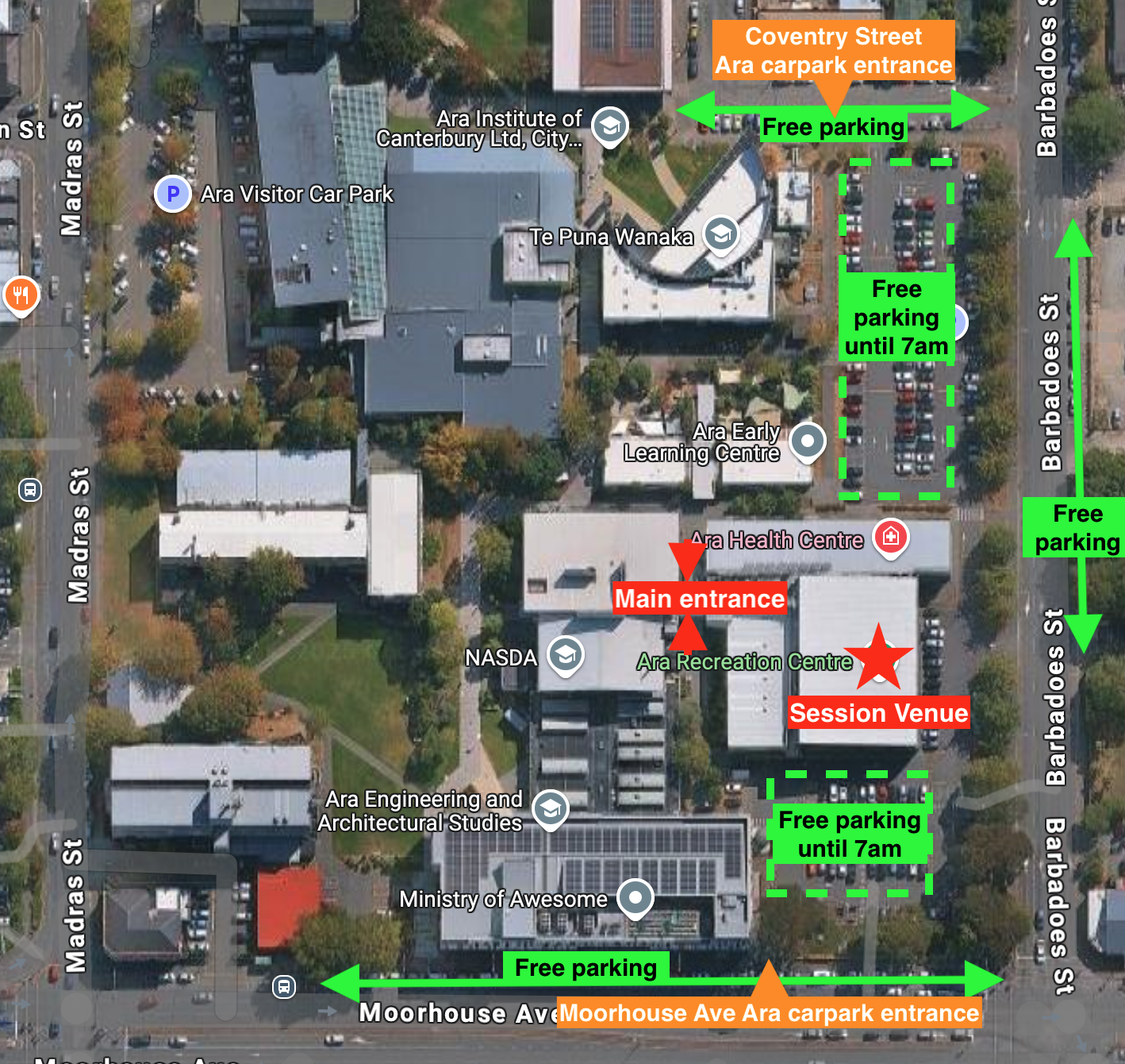 Free parking available in the Ara carpark until 7.00am. Entrance to this carpark is via either Moorhouse Ave or Coventry Street (see map below).
